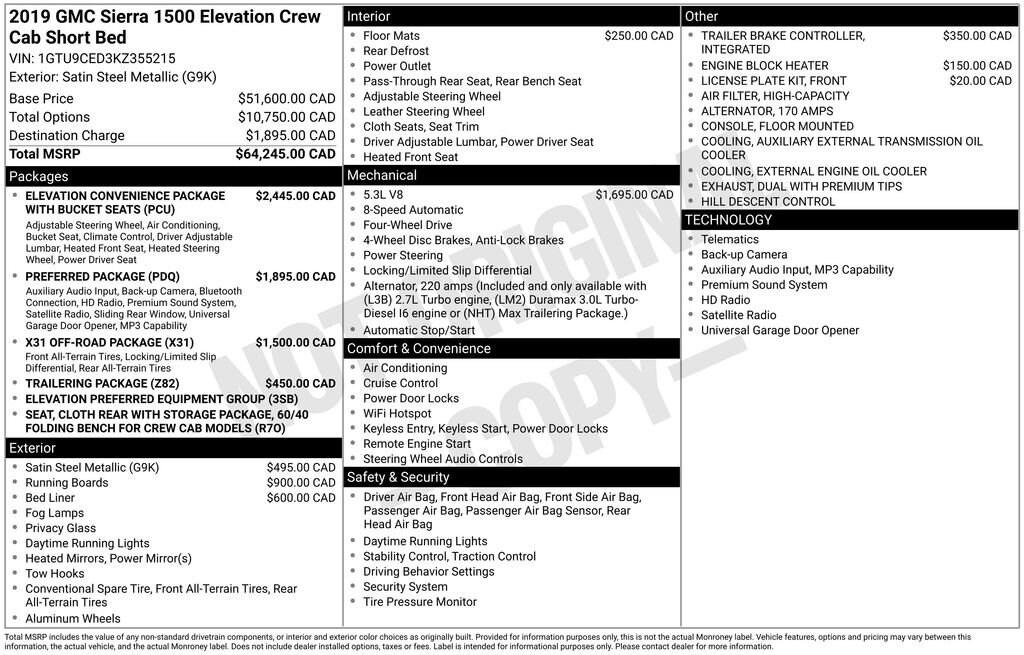 *Please inquire for a personalized Video Walk-Around of this vehicle! Nationwide shipping available!*This 2019 GMC Sierra 1500 Elevation is a rugged and capable pickup that's ready to take on any adventure. Equipped with a powerful EcoTec3 5.3L V8 engine and 4-wheel drive, this Sierra delivers exceptional performance and versatility. Featuring a bold, stylish exterior and a well-appointed interior, this truck is the perfect blend of form and function.- Remote Vehicle Starter System- Power Rear Windows with Express Down- Apple CarPlay/Android Auto- GMC 4G LTE and Connected Services- Heated Door Mirrors- LED Cargo Area Lighting- Cloth Seat Trim- Rear Rubberized-Vinyl Floor Mats- Exterior Parking Camera Rear- Keyless Open & StartThe Sierra 1500 Elevation's impressive list of features ensures you'll enjoy a comfortable, convenient, and connected driving experience. With its rugged construction, advanced safety technologies, and premium amenities, this truck is ready to take on any task or adventure with confidence.Whether you're hauling heavy loads, navigating rough terrain, or simply commuting in style, the 2019 GMC Sierra 1500 Elevation is the perfect companion. Its powerful engine, capable 4WD system, and impressive array of features make it a standout in the full-size pickup segment.Imagine yourself behind the wheel of this impressive truck, taking on the open road or tackling your toughest jobs with ease. The Sierra 1500 Elevation is the perfect blend of performance, style, and practicality, making it an exceptional choice for discerning truck buyers.Experience the unparalleled capability and refinement of the 2019 GMC Sierra 1500 Elevation. Contact us today to schedule a test drive and see for yourself why this truck is the perfect fit for your lifestyle.