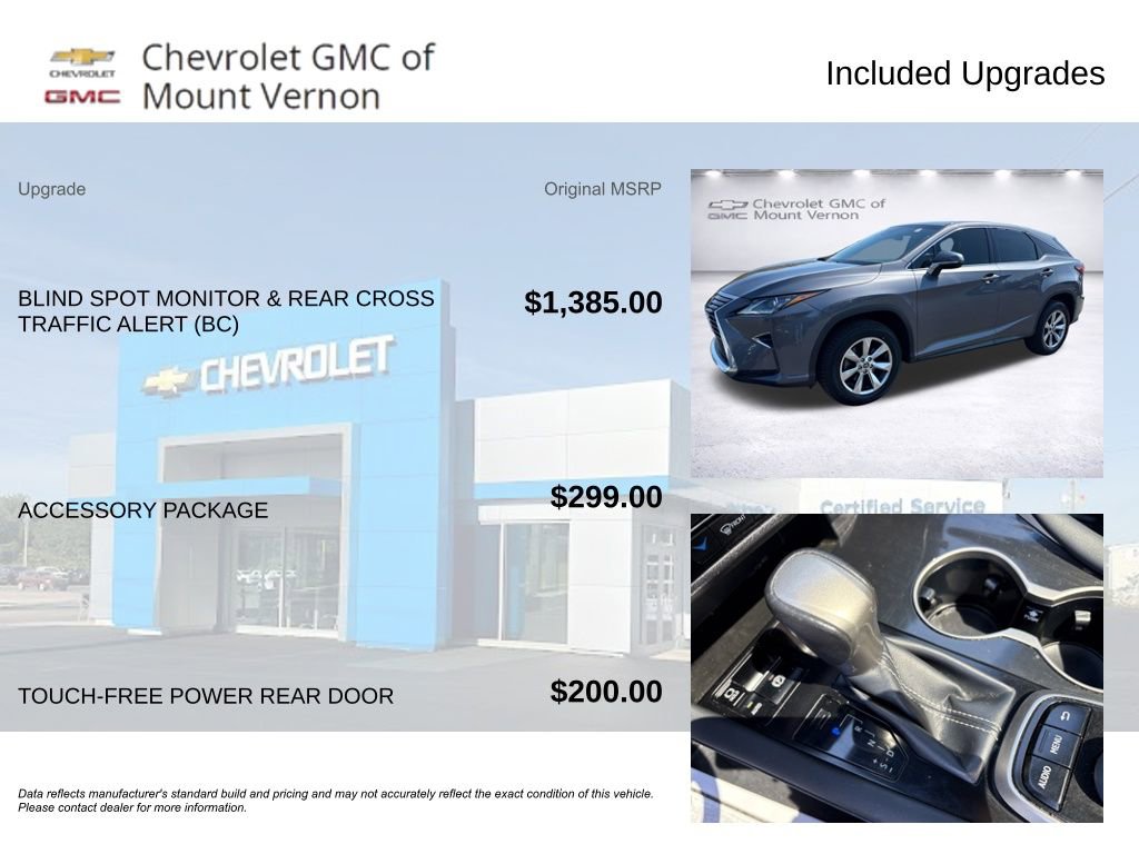Safety is a top priority in this Lexus RX 350. The Blind Spot Monitor, Rear Cross Traffic Alert, and Rear View Camera provide added peace of mind, while the Dual Front Impact Airbags, Dual Front Side Impact Airbags, and Overhead Airbag system offer comprehensive protection.